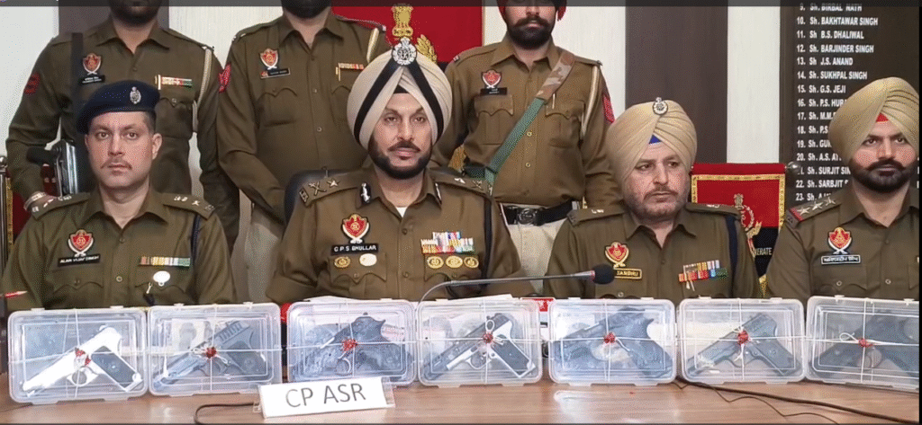 ਅੰਮ੍ਰਿਤਸਰ ਪੁਲਿਸ ਕਮਿਸ਼ਨਰ ਗੁਰਪ੍ਰੀਤ ਸਿੰਘ ਭੁੱਲਰ ਨੇ ਮੀਡੀਆ ਨਾਲ ਗੱਲਬਾਤ ਕਰਦੇ ਹੋਏ ਕਿਹਾ ਕਿ ਅੰਮ੍ਰਿਤਸਰ ਕਮਿਸ਼ਨਰੇਟ ਪੁਲਿਸ ਨੇ ਖੁਫੀਆ ਜਾਣਕਾਰੀ ਦੇ ਆਧਾਰ ’ਤੇ ਵੱਡੀ ਕਾਰਵਾਈ ਕਰਦੇ ਹੋਏ ਪਾਕਿਸਤਾਨ ਨਾਲ ਜੁੜੇ ਹਥਿਆਰ ਤਸਕਰੀ ਮਾਡਿਊਲ ਦਾ ਪਰਦਾਫ਼ਾਸ਼ ਕੀਤਾ ਹੈ। ਪੁਲਿਸ ਨੇ ਦੋ ਵਿਅਕਤੀਆਂ ਨੂੰ ਗ੍ਰਿਫ਼ਤਾਰ ਕਰਦੇ ਹੋਏ ਸੱਤ ਆਧੁਨਿਕ ਪਿਸਤੌਲ—ਜਿਨ੍ਹਾਂ ਵਿੱਚ ਤਿੰਨ PX5 ਅਤੇ ਚਾਰ .30 ਬੋਰ ਸ਼ਾਮਲ ਹਨ—ਬਰਾਮਦ ਕੀਤੇ ਹਨ। ਇਹ ਗ੍ਰਿਫ਼ਤਾਰੀਆਂ ਸਰਹੱਦ ਪਾਰੋਂ ਆ ਰਹੀ ਗੈਰਕਾਨੂੰਨੀ ਗਤੀਵਿਧੀ ’ਤੇ ਵੱਡਾ ਝਟਕਾ ਮੰਨੀ ਜਾ ਰਹੀਆਂ ਹਨ।